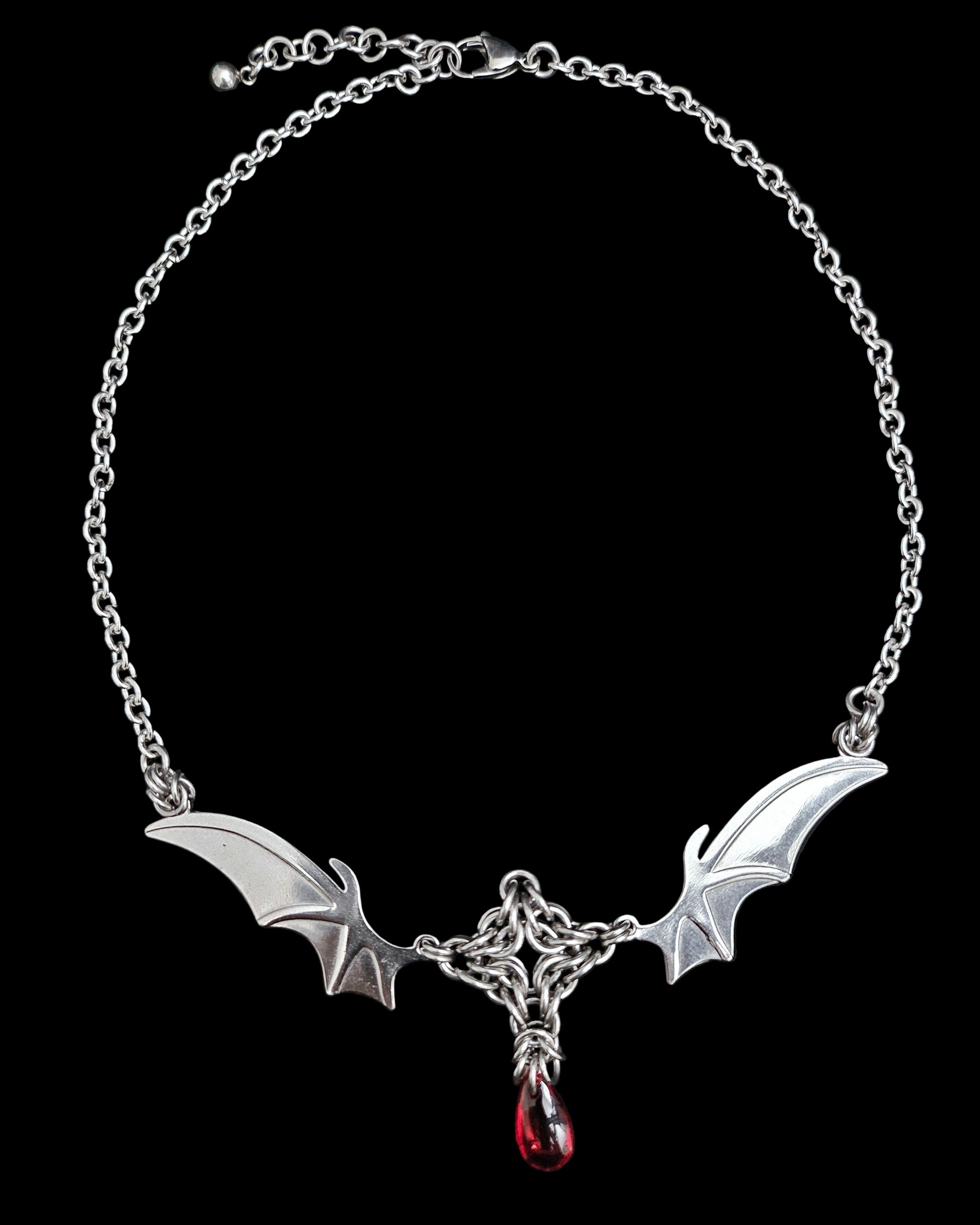 Flanked by stainless steel bat wings and adorned with a red glass teardrop, BLOODLUST is the perfect piece to channel your inner vampire.