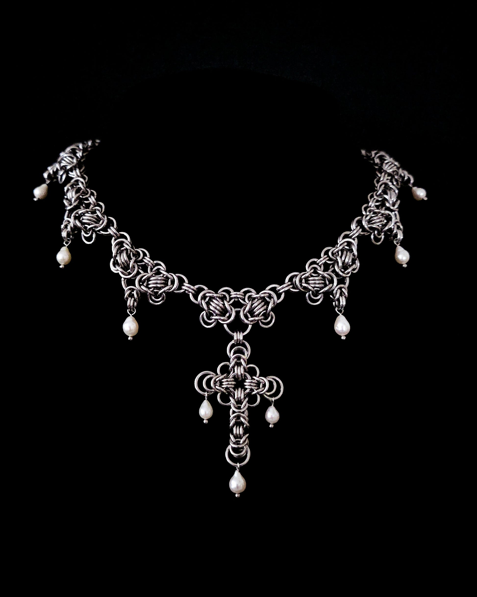 ATONEMENT features an intricate chainmaille cross, adorned with white teardrop pearls. Crafted from over 500 individually woven rings, this piece remains one of our most detailed designs to date.