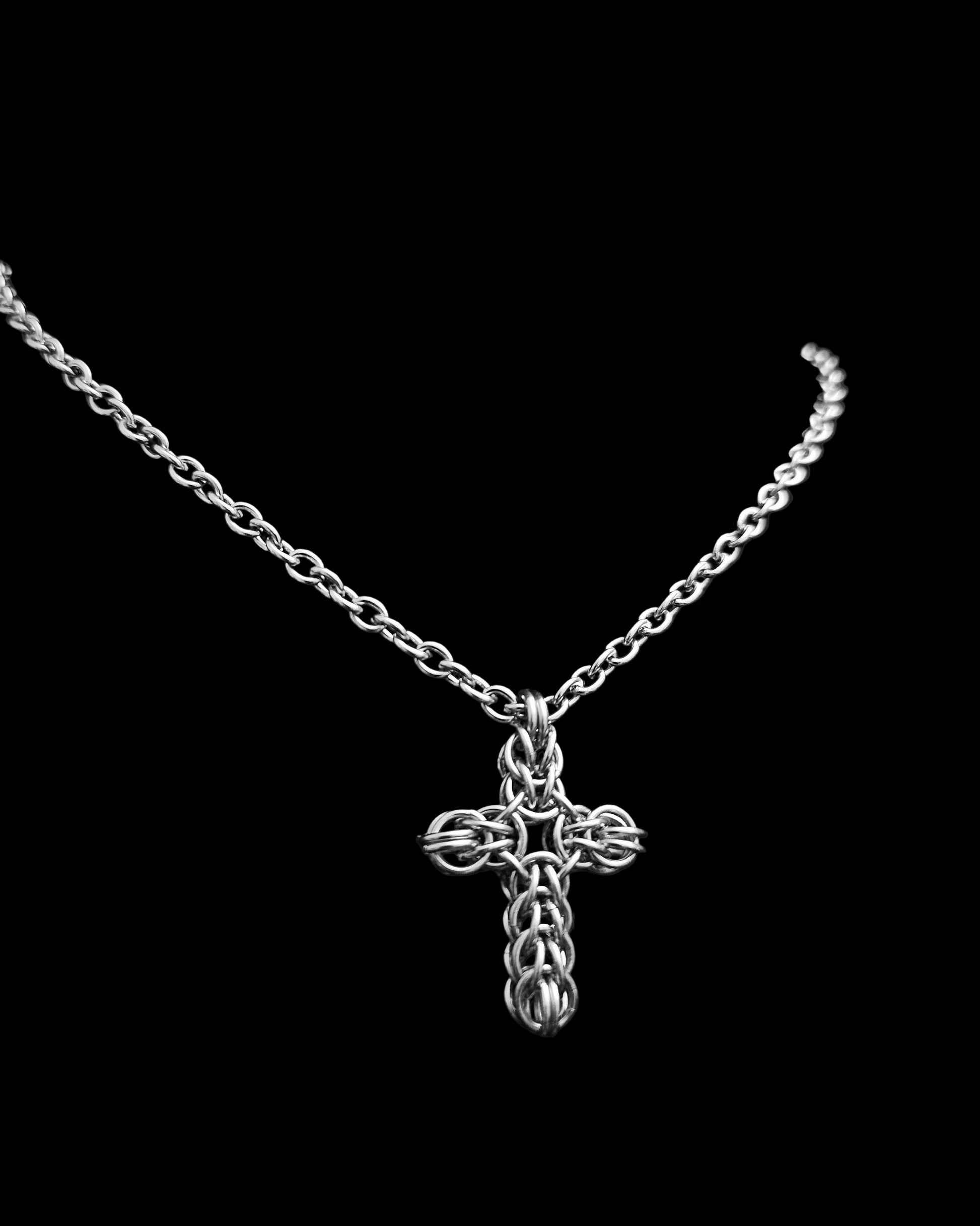 The CRUCIFIX pendant feature an intricate yet delicate chainmaille cross, finished with a lobster clasp.