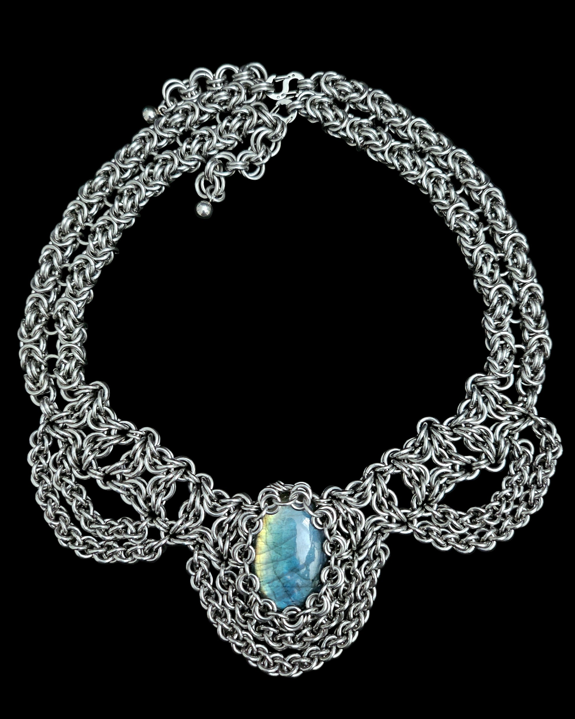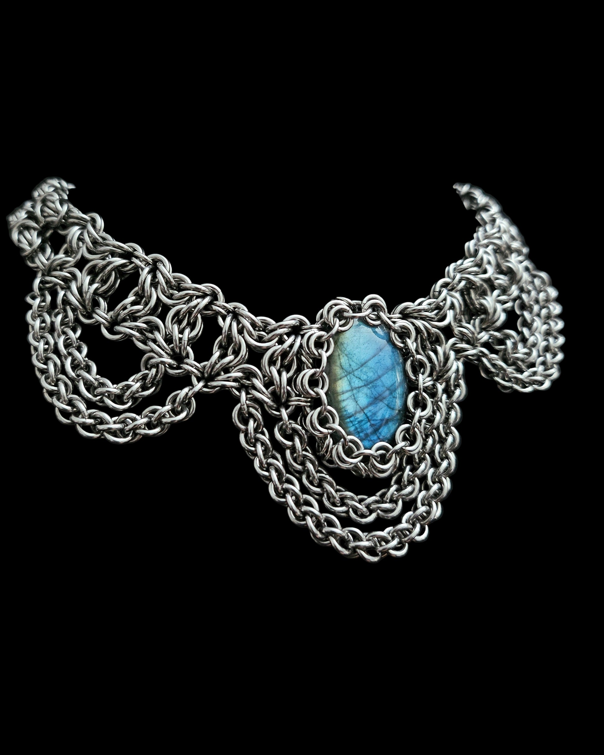 OCEANUS is a heavily detailed choker featuring a natural blue-green labradorite centrepiece. Handcrafted from over 1000 stainless steel rings and finished with dual s-shaped gate clasps, this necklace is truly one-of-a-kind.