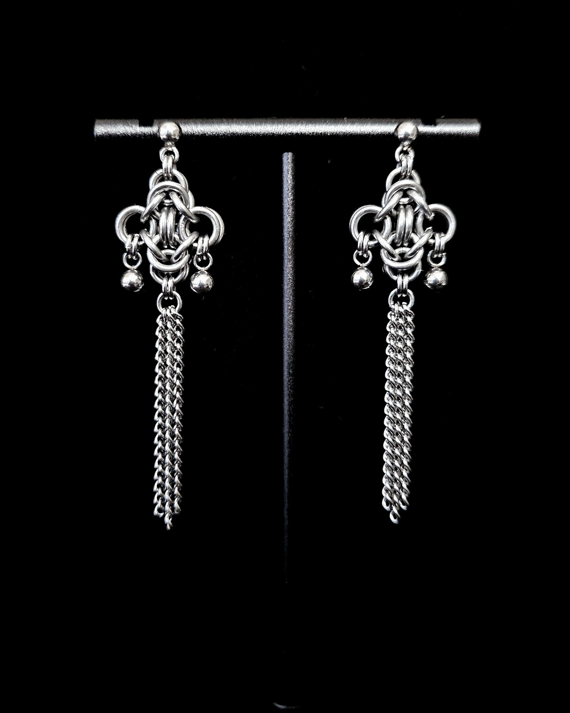 Inspired by Chinese decorative knotwork, the LUCKY KNOT earrings are woven from solid stainless steel, featuring charm accents and tassels of delicate chain.