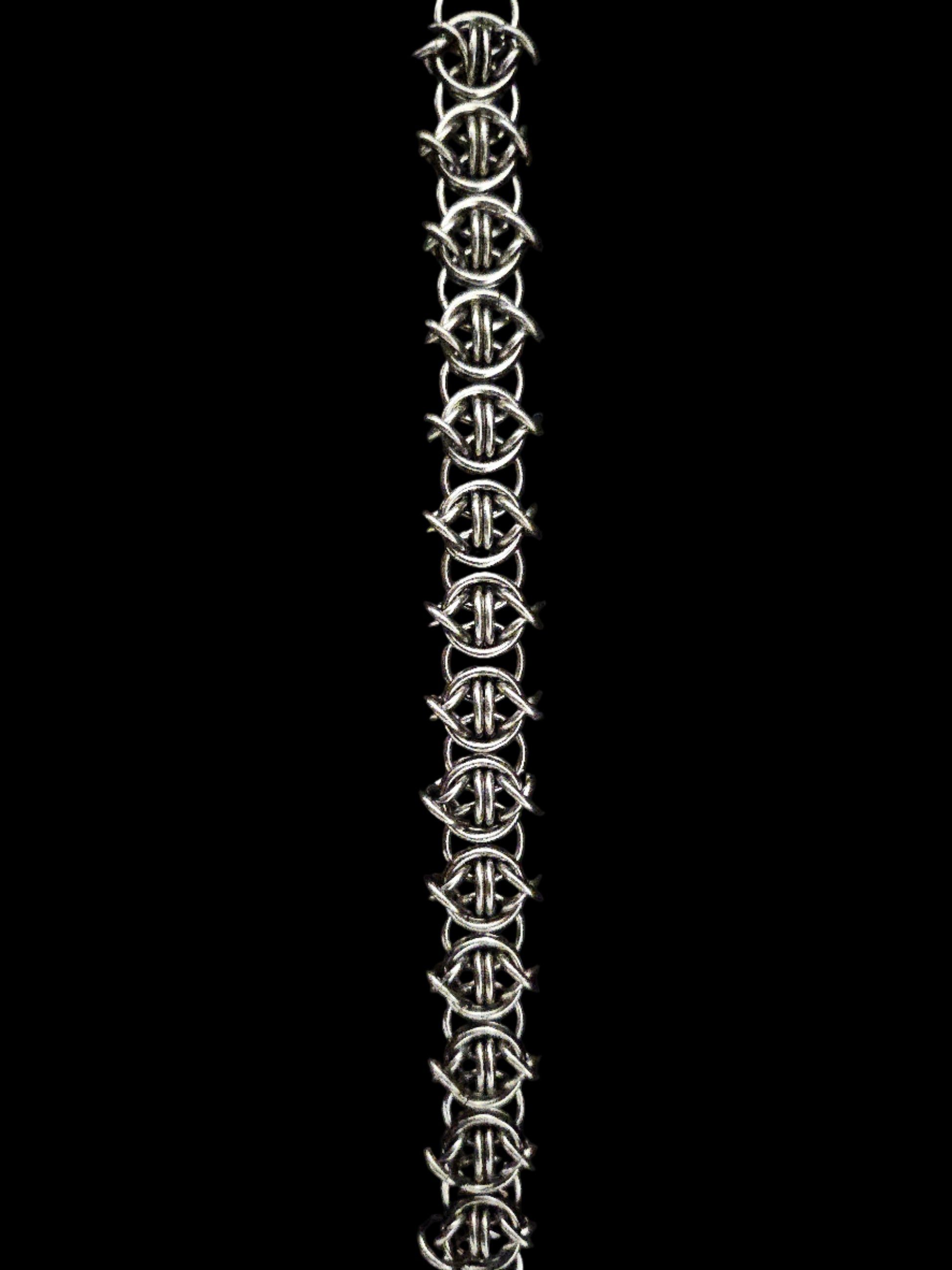 OCULUS is a barbed-wire style chain finished with an s-shaped carabiner clasp.