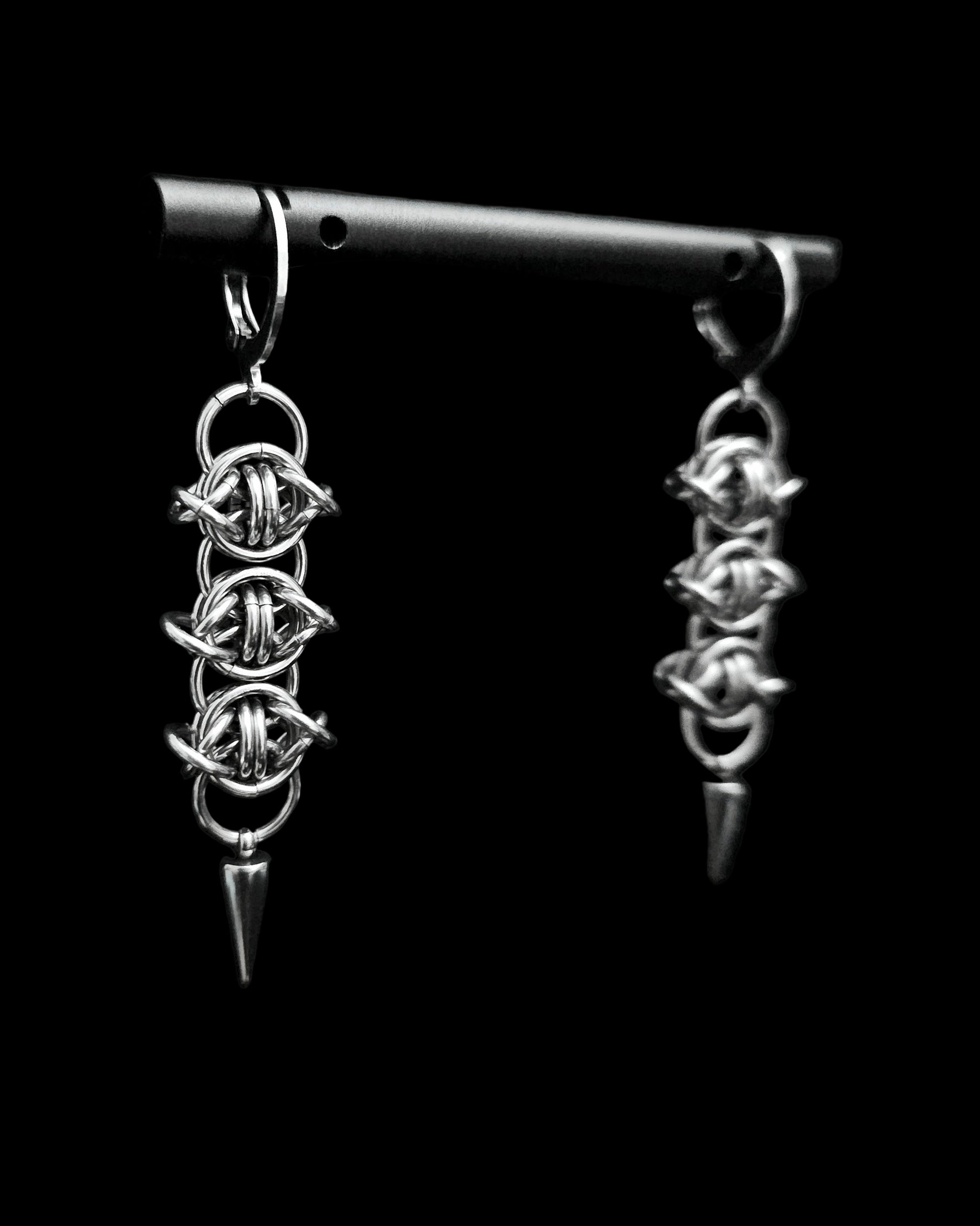 OCULUS are barbed-wire style earrings, adorned with spikes and finished with leverback hoops.