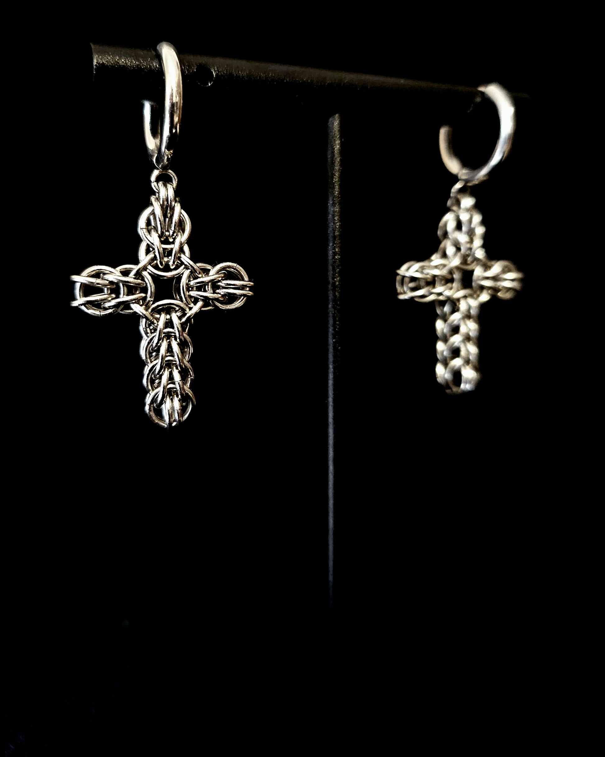 The CRUCIFIX earrings feature an intricate yet delicate chainmaille cross; available as hoops or studs.
