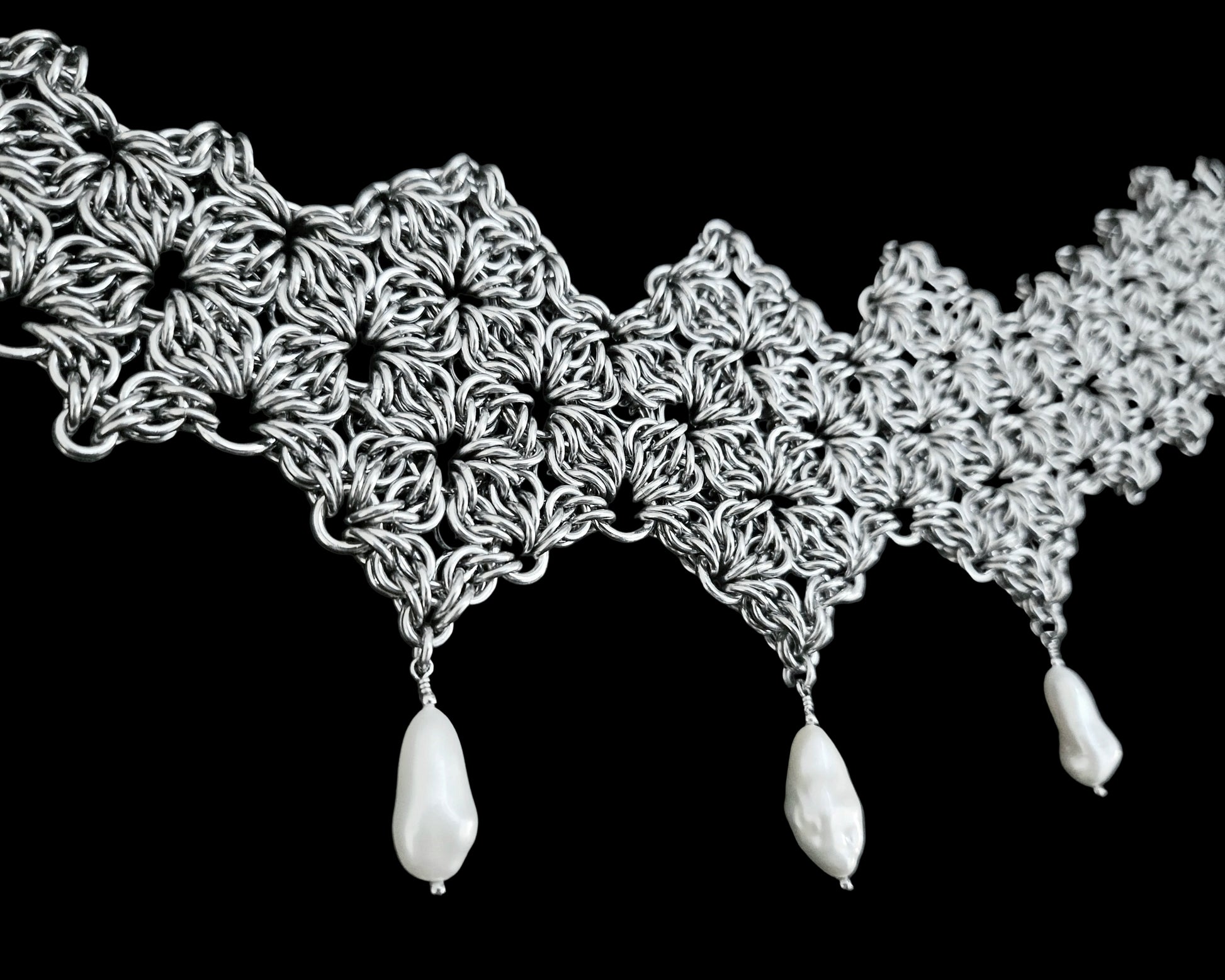 Crafted over ten hours from over 1000 individual rings, SERAPHIM is a true labour of love. This intricate choker combines the elegance of lacework with the sturdiness of stainless steel, for a head-turning end product.
