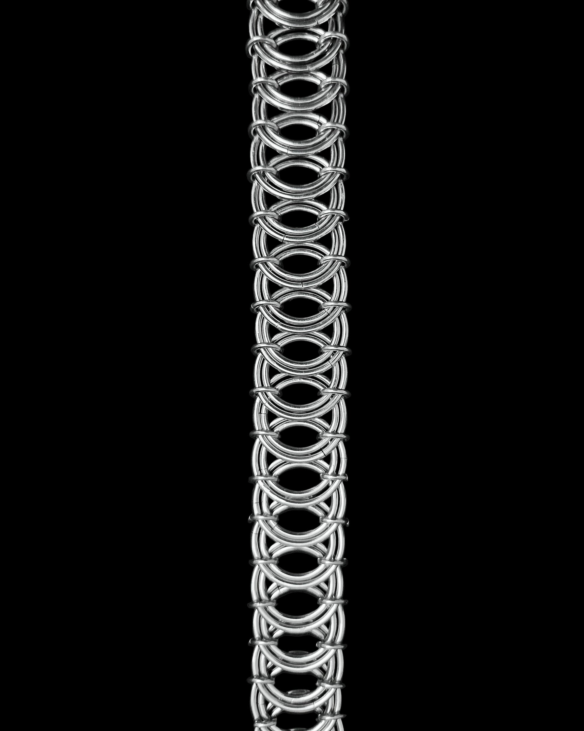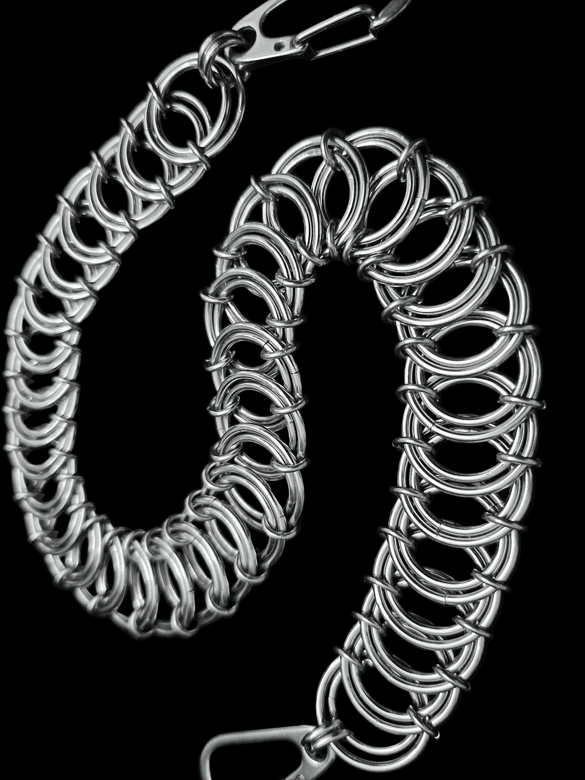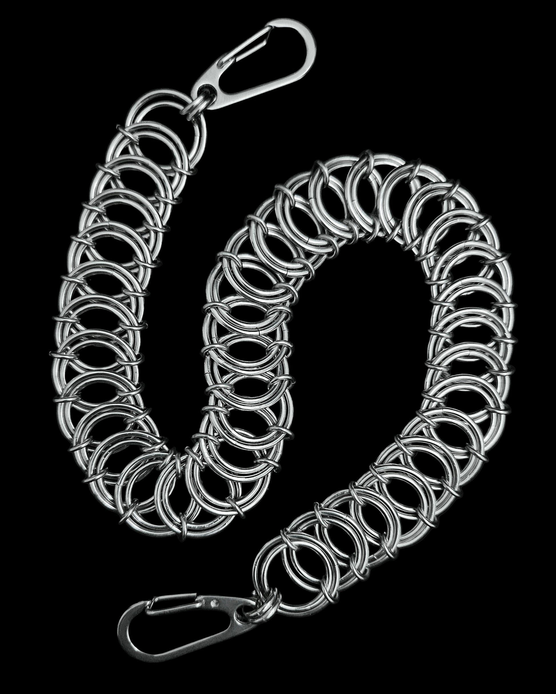 VERTEBRAE is a flat belt chain, fitted with sturdy 30mm gate clasps at either end.